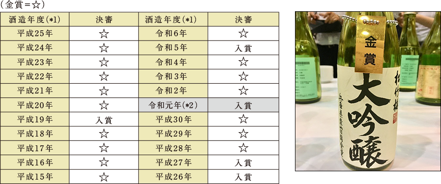 (金賞=☆) ※1)令和6年酒造年度全国新酒鑑評会の決審は令和7年5月に行われたため、商品には「令和7年全国新酒鑑評会金賞受賞酒」と表記しています。 ※2)令和元酒造年度は、全国新酒鑑評会の決審中止のため金賞選定は行っておりません。
